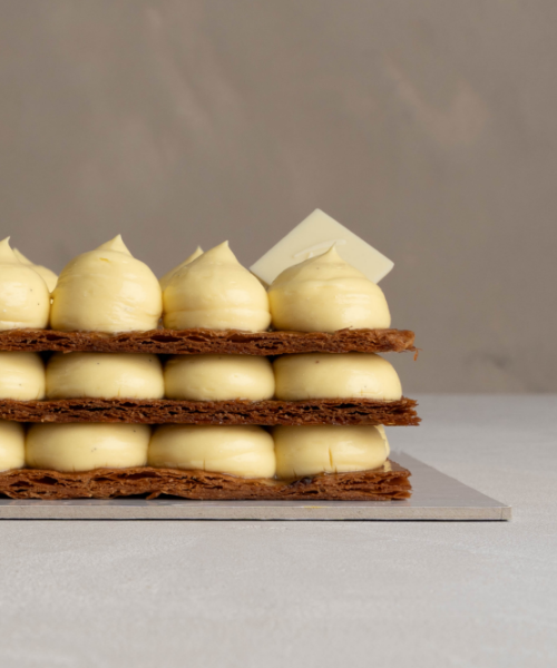 Crema pasticcera diplomatica: panna fresca pastorizzata (latte), latte fresco pastorizzato intero Alta Qualità (latte), tuorlo d’uovo fresco pastorizzato (uova), zucchero semolato, burro (latte), amido di mais, amido di riso, gelificante: gelatina animale, vaniglia in bacca, olio essenziale di limone.